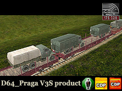 Po poradě s kámošem jsem došel k závěru (byl jsem přesvědčen), že zvládnu naložit V3S na vagóny. Tak vznikl balík tří vojenských variant pragovek, které jdou naložit jako produkt na plošinové vagóny. S úspěchem to bylo vyzkoušeno na CD_Res_TRS od stelerp(a) jako alternativa k 20 ft container. Poté co auta se zakusovala předmími koly do čel vagónů, jsem je kousek posunul a výsledek je takový, že trochu přečuhují zadkem, ale dá se to vydržet.